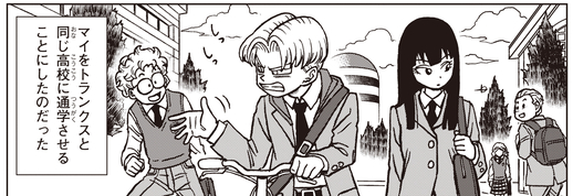 Ein paar Tage später besucht Mai zusammen mit Trunks und Goten die Blue Hal Highschool.