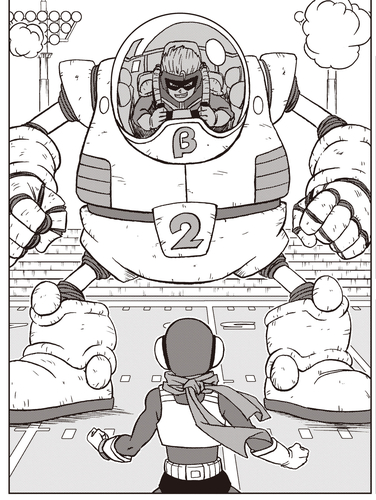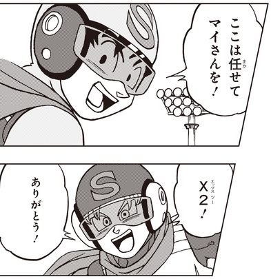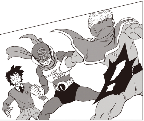 Nach der Schule, während er Trunks eine weitere Falle stellt, entdeckt Beta No. 1 stattdessen Goten, der seine Superkraft einsetzt, um einen Lastwagen hochzuheben, und greift ihn an! Goten ist in den Seilen, nicht in der Lage, ernsthaft in der Schule zu kämpfen, weil er riskiert, seine Identität preiszugeben, aber zum Glück kommt Trunks gerade noch rechtzeitig als Saiyaman X1 auf der Bildfläche an!