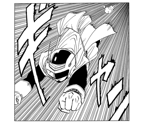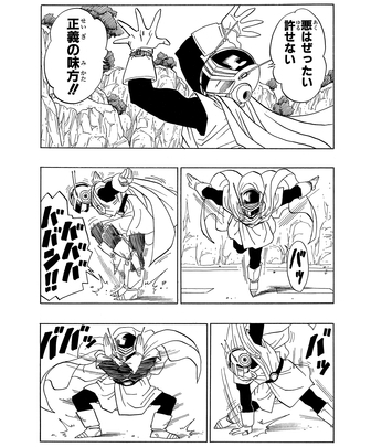 Er rettet Videl, der bereits gegen die hinterhältigen Verbrecher kämpfte, bevor er ihnen die erstaunliche Pose und Selbstvorstellung zeigt, die er in der Nacht zuvor zwei Stunden lang geübt hatte.