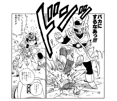 Die beiden tobenden Fahrer waren jedoch eindeutig zu dicht, um die Großartigkeit des Great Saiyaman zu würdigen, und lachten: „Ha, ha, ha!! Das ist so lahm!! Es passt aber zu dem lahmen Outfit!!“ Ihre Ignoranz ging dem Großen Saiyaman unter die Haut, der deutlich machte, wie ernst er es meinte, was das Duo veranlasste, über ihre Taten nachzudenken, bevor sie davonfuhren.