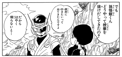 Nachdem die Räuber gefangen und Videl übergeben worden waren, offenbarte ein Versprecher der Tochter von Mr. Satan die Identität des Großen Saiyaman; er ist kein anderer als der Krieger Gohan!