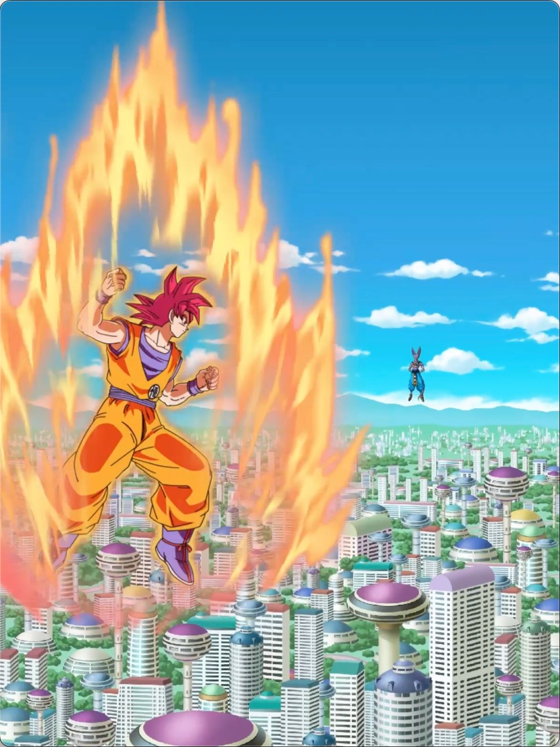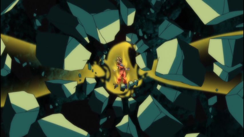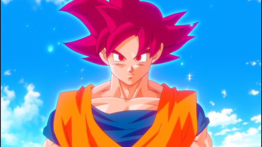 In der Szene, in der sich Goku zum ersten Mal in einen Super Saiyan God verwandelt, hält er Händchen mit seinen Verbündeten in einem Ring, während Bilder eines Great Ape, des Planet Vegeta, des Planeten Erde und des alten Super Saiyan God im Hintergrund aufblitzen und darstellen, wie er wird ein gottesfürchtiger Krieger, der die weiten Grenzen des Universums überschreitet.