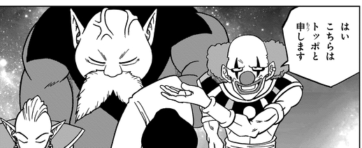 Er bringt sogar Toppo mit, als der Great Priest ein Notfalltreffen der Götter der Destruction einberuft.