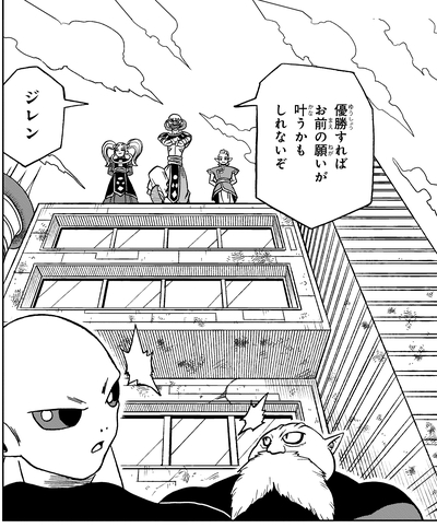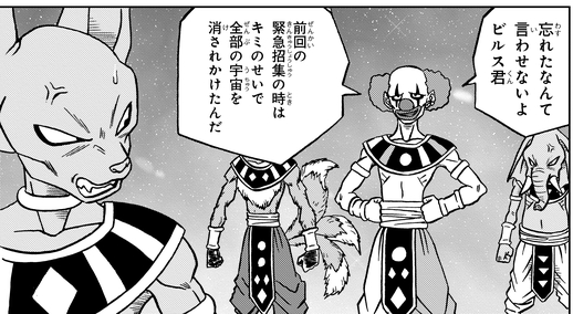 Dort fordert er Beerus heraus und erklärt, dass der God of Destruction von Universum 7 der Grund dafür war, dass alle Universen bei ihrer letzten göttlichen Versammlung fast zerstört wurden, was auch die anderen Götter gegen Beerus aufbringt.