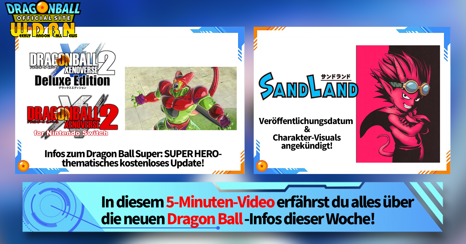 "Weekly Dragon Ball News" ist eine Videoserie, die jeden Montag (JST) aktualisiert wird, um Ihnen die neuesten Nachrichten in der Welt von Dragon Ball zu bringen! Schließen Sie sich V Jump Redakteur Victory Uchida an, wenn er über die heißesten Informationen der vergangenen Woche sowie über neue Updates wie neue Produktinformationen und Website-News für die kommende Woche berichtet!