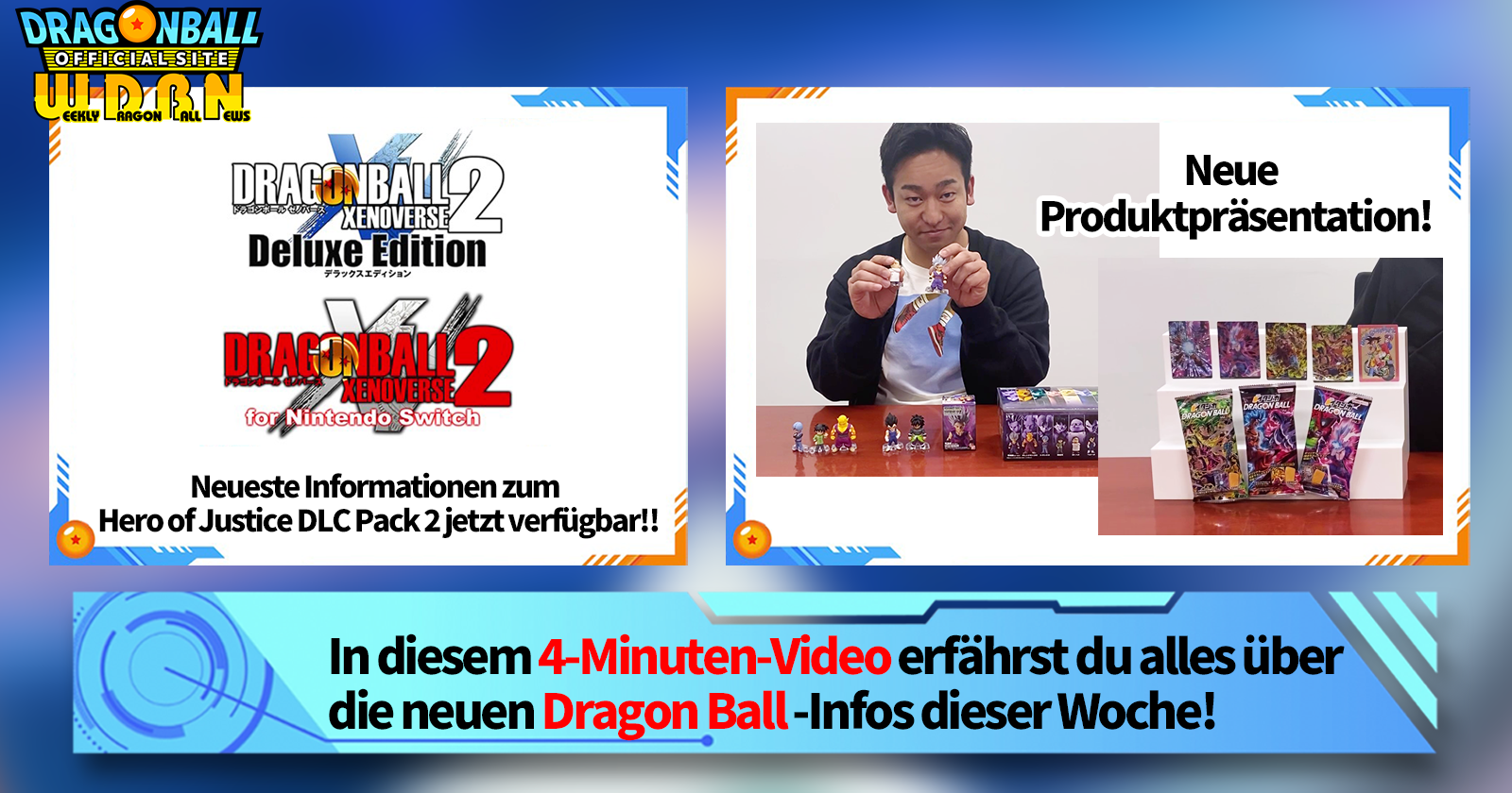 "Weekly Dragon Ball News" ist eine Videoserie, die jeden Montag (JST) aktualisiert wird, um Ihnen die neuesten Nachrichten in der Welt von Dragon Ball zu bringen! Schließen Sie sich V Jump Redakteur Victory Uchida an, wenn er über die heißesten Informationen der vergangenen Woche sowie über neue Updates wie neue Produktinformationen und Website-News für die kommende Woche berichtet!