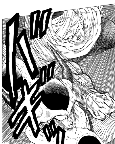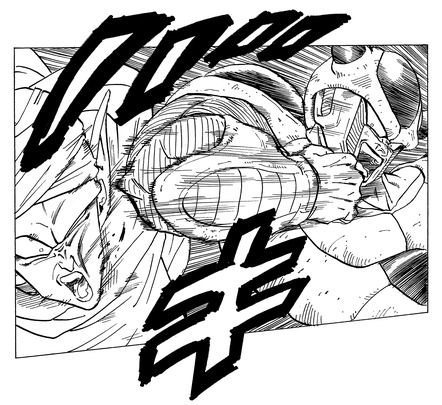 Gohan greift ihn wütend an, aber sein Angriff hat keine Wirkung auf den Tyrannen, der antwortet, indem er sagt: "Jetzt werde ich den Schmerz erwidern, der mir zugefügt wurde ... viele Male ..." und ein Sperrfeuer von Unerbittlichkeit entfesselt bläst auf ihn.
