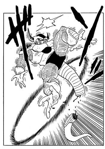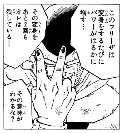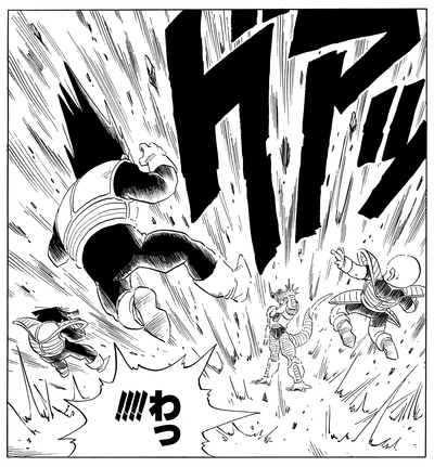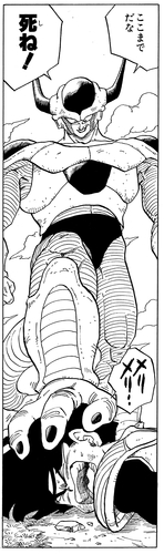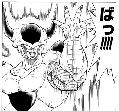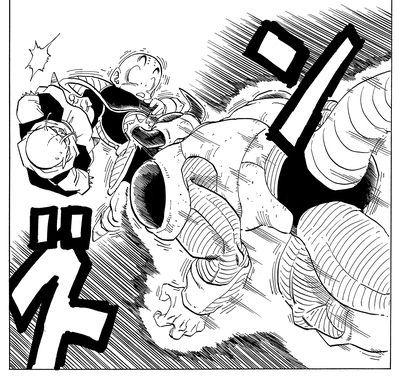 Gerade als Frieza Gohan den letzten Schlag versetzen will, schleudert Krillin einen Kienzan auf ihn und schneidet ihm die Schwanzspitze ab!