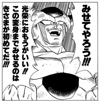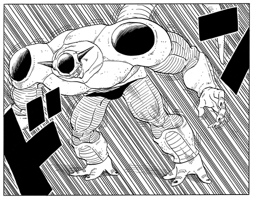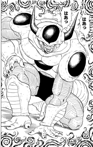 Frieza lädt seinen Körper mit Ki auf, zerstört seine eigene Kampfrüstung und verwandelt seine schlanke, bescheidene Gestalt in die eines massigen Monsters.