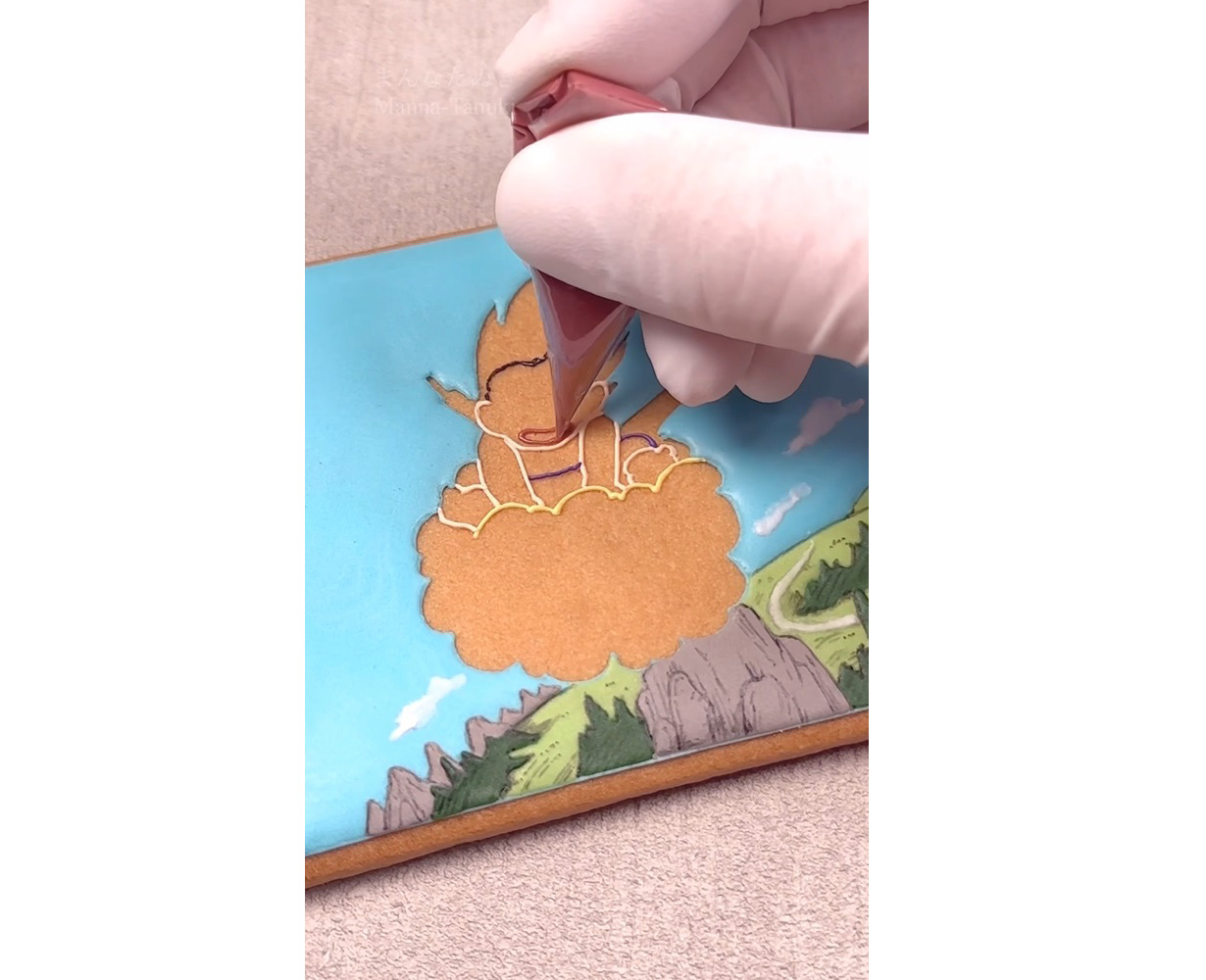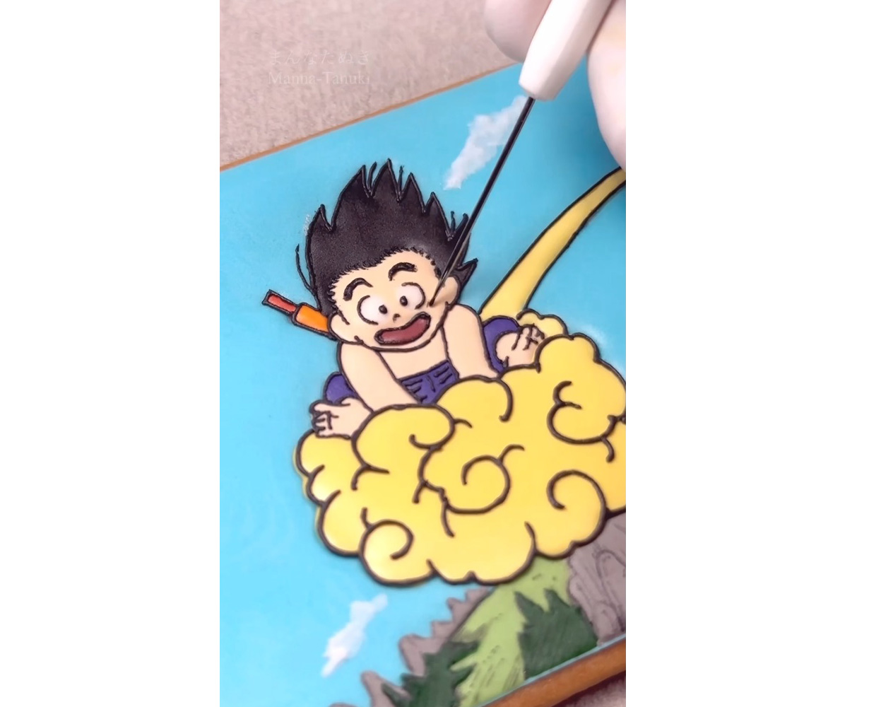 Manna-Tanuki: Die Hintergründe. Es war wirklich schwierig, die dünnen Linien zu zeichnen und sie gleichzeitig ordentlich zu halten. Und dann waren auch die Charaktere selbst schwierig. Die Gesichter aller Charaktere von Toriyama zeichnen sich durch eine ganz besondere Ausgewogenheit und einen Ausdruck aus, der nur schwer richtig hinzubekommen ist. Daher ist es sehr schwierig, sie mit Zuckerguss nachzubilden, ohne dass etwas schief geht.