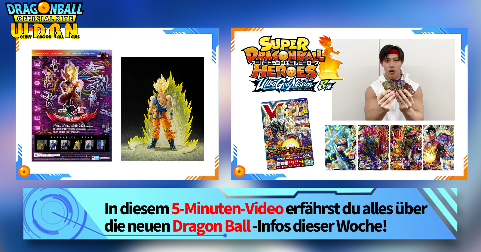 "Weekly Dragon Ball News" ist eine Videoserie, die jeden Montag (JST) aktualisiert wird, um Ihnen die neuesten Nachrichten in der Welt von Dragon Ball zu bringen! Schließen Sie sich V Jump Redakteur Victory Uchida an, wenn er über die heißesten Informationen der vergangenen Woche sowie über neue Updates wie neue Produktinformationen und Website-News für die kommende Woche berichtet!