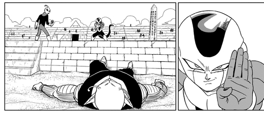 Piccolo weicht Frosts Angriffen aus und erhebt sich in die Luft, um mit seinen ausfahrbaren Armen zurückzuschlagen, mit dem Ziel, die Ausdauer des Kriegers aus dem Universe 6 zu erschöpfen. Frost ist jedoch wieder einmal in der Lage, seinen Gegner für einen Moment mit einem Schlag mit der rechten Hand zu betäuben, und verschwendet keine Zeit damit, ihn ins Aus zu werfen.