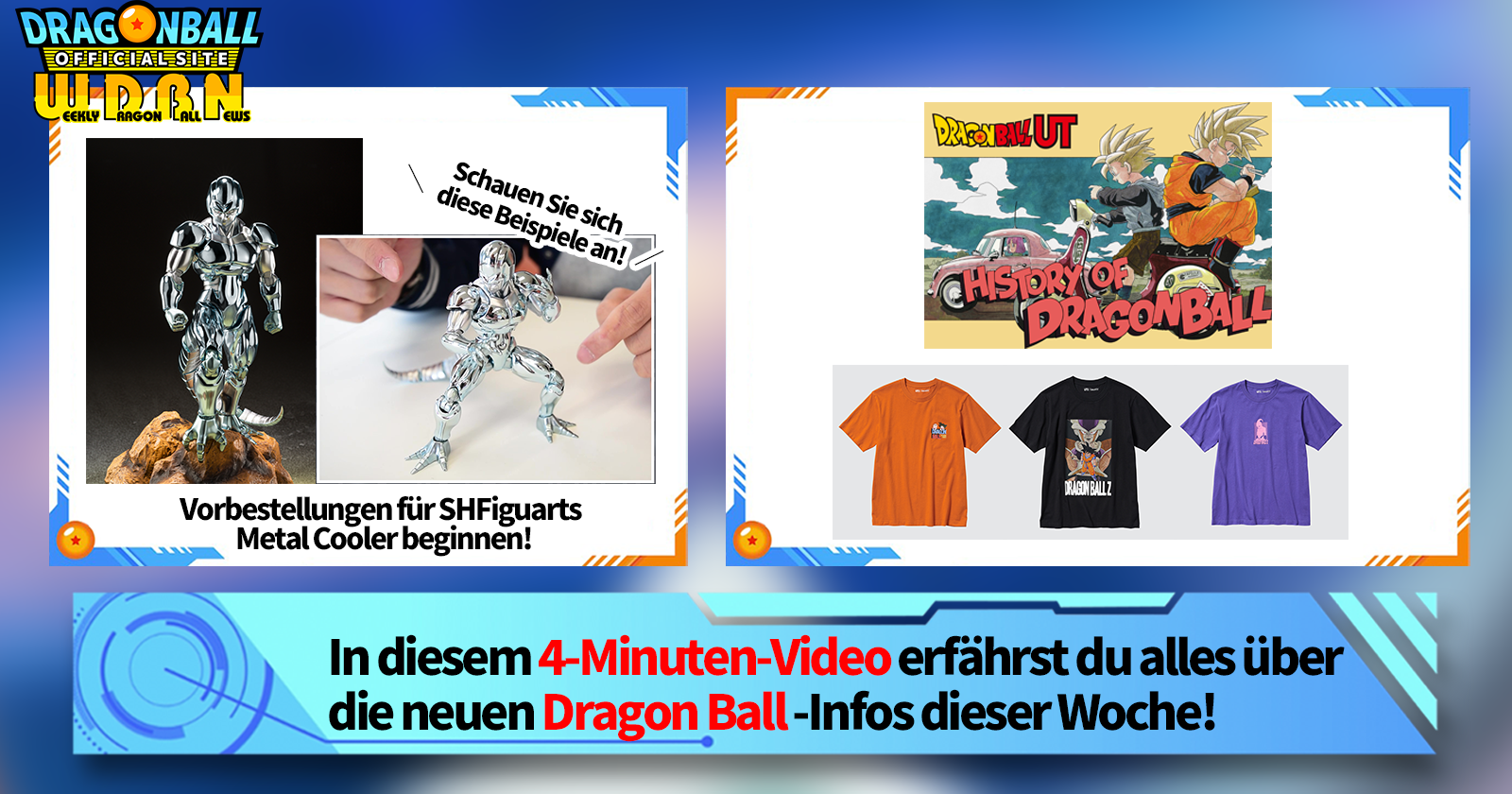 "Weekly Dragon Ball News" ist eine Videoserie, die jeden Montag (JST) aktualisiert wird, um Ihnen die neuesten Nachrichten in der Welt von Dragon Ball zu bringen! Schließen Sie sich V Jump Redakteur Victory Uchida an, wenn er über die heißesten Informationen der vergangenen Woche sowie über neue Updates wie neue Produktinformationen und Website-News für die kommende Woche berichtet!