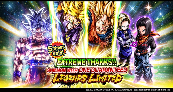 Eine Aufforderung, unsere Wertschätzung für all Ihre Unterstützung zum Ausdruck zu bringen! Bei dieser aufeinanderfolgenden Beschwörung ist ein LEGENDS LIMITED-Charakter garantiert, den Sie bis zu 5 Mal spielen können! Das erstaunliche Sortiment umfasst Ultra Instinct Goku (DBL47-01S), Android #17 und Android #18 (DBL46-01S) und mehr!