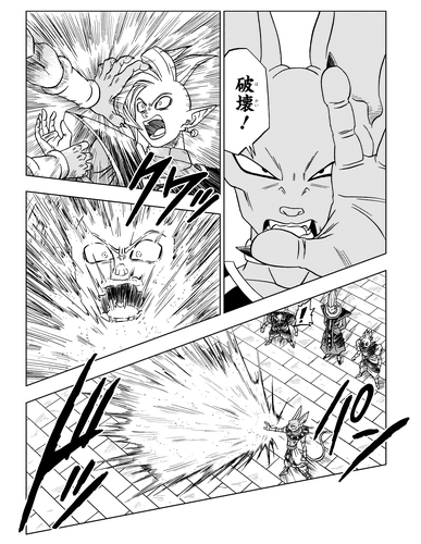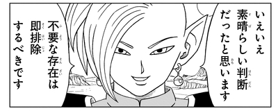Zamasu erklärt: „Wenn mein Plan in der Zukunft bereits erfolgreich war, ist es umso sicherer, dass ich jetzt nicht sterbe“, und versucht dann gewaltsam, seine böse Mission auf der Stelle zu starten, nur um schnell zerstört zu werden von Beerus.