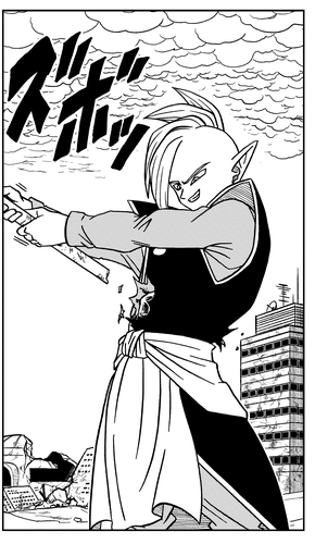 Trunks wehrt sich hartnäckig gegen Goku Black und schafft es sogar, ihn zu verletzen, doch Zamasu erscheint und nutzt seine Wiederherstellungskräfte, um den Schaden zu heilen.
