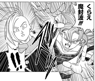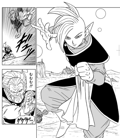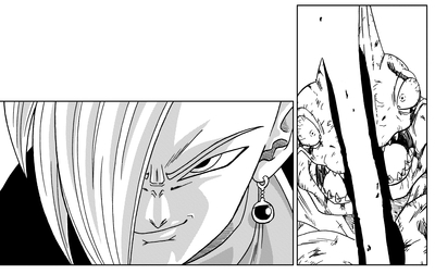 In einem letzten verzweifelten Versuch, diese teuflische, selbstgerechte Macht der Zerstörung zu stürzen, entfesselt Goku die Mafu-ba , um ihn zu versiegeln. Während es zunächst funktioniert zu haben scheint, hatte Goku fälschlicherweise das falsche Siegel für die Technik verwendet, wodurch Zamasu knapp entkommen konnte. Obwohl Goku nicht in der Lage ist, Zamasu dauerhaften Schaden zuzufügen, frustriert er seinen Gegner nach und nach mit einer unaufhörlichen Flut von Angriffen, was dazu führt, dass Zamasu mit dem Potara mit Goku Black verschmilzt.