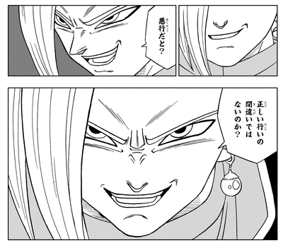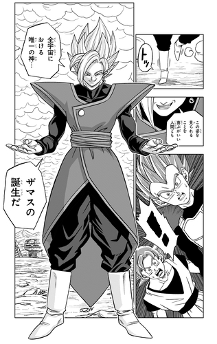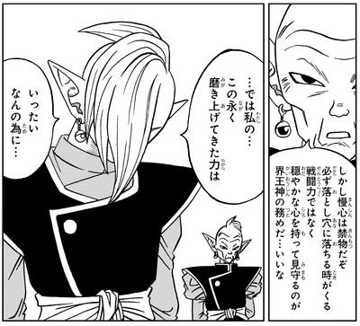 Als man ihm sagt, dass ein Supreme Kai stets eine ruhige und sanfte Seele bewahren muss, während er über das Universum wacht, antwortet Zamasu, der noch immer fest davon überzeugt ist, dass Stärke eingesetzt werden muss, um das Böse zu unterdrücken, hartnäckig: „Warum dann... Warum habe ich Geld ausgegeben?“ all diese Zeit und Mühe, um diese Macht zu erlangen?“