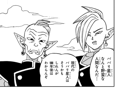 Anschließend nutzt Gowasu den Ring of Time , um den Planet Babari 1.000 Jahre in der Zukunft zu besuchen. Als Zamasu sieht, dass die Wesen dort immer noch ihr gewalttätiges Verhalten nicht geändert haben, ergreift er Maßnahmen und spaltet einen potenziellen Angreifer in zwei Teile.