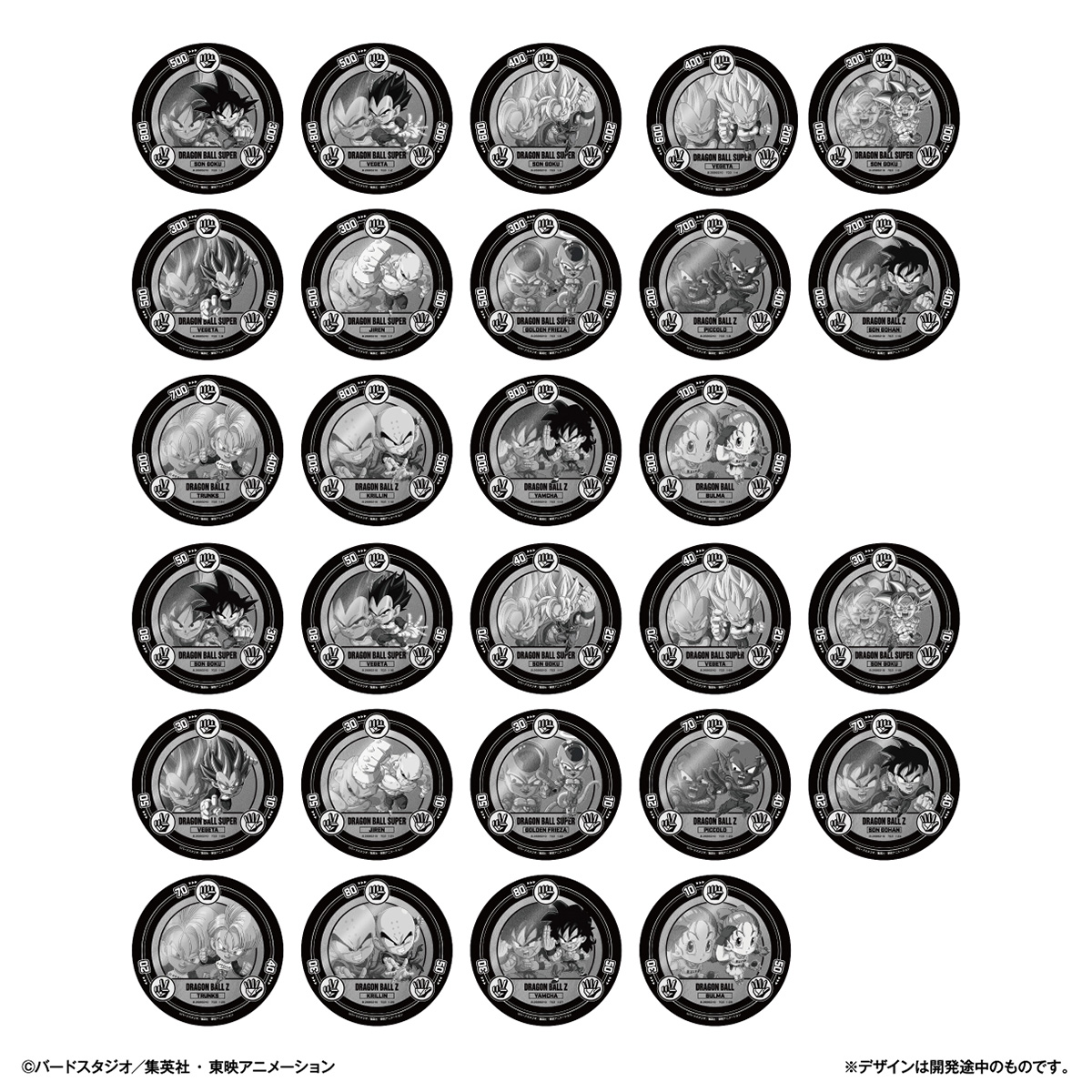 Jede Packung enthält einen Untersetzer mit einer vollfarbig gedruckten SD-Illustration oben und einer monochromen SD-Illustration und Spielstatistiken unten.