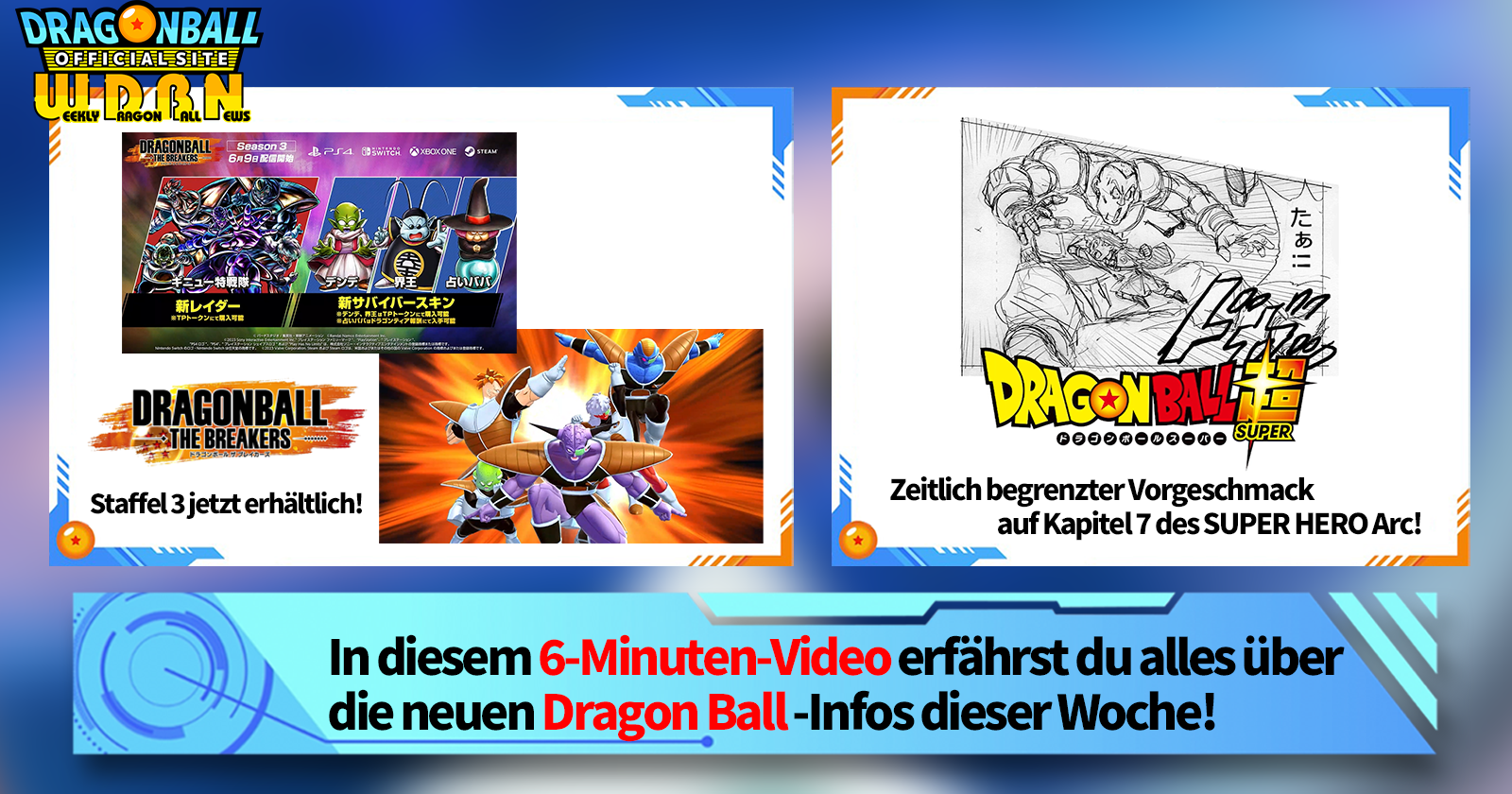 „Weekly Dragon Ball News“ ist eine Videoserie, die jeden Montag (JST) aktualisiert wird, um Ihnen die neuesten Nachrichten aus der Welt von Dragon Ball zu liefern! Begleiten Sie V Jump Redakteur Victory Uchida, wenn er über die heißesten Informationen der vergangenen Woche sowie über aktuelle Updates wie neue Produktinformationen und Website-Neuigkeiten für die kommende Woche berichtet!