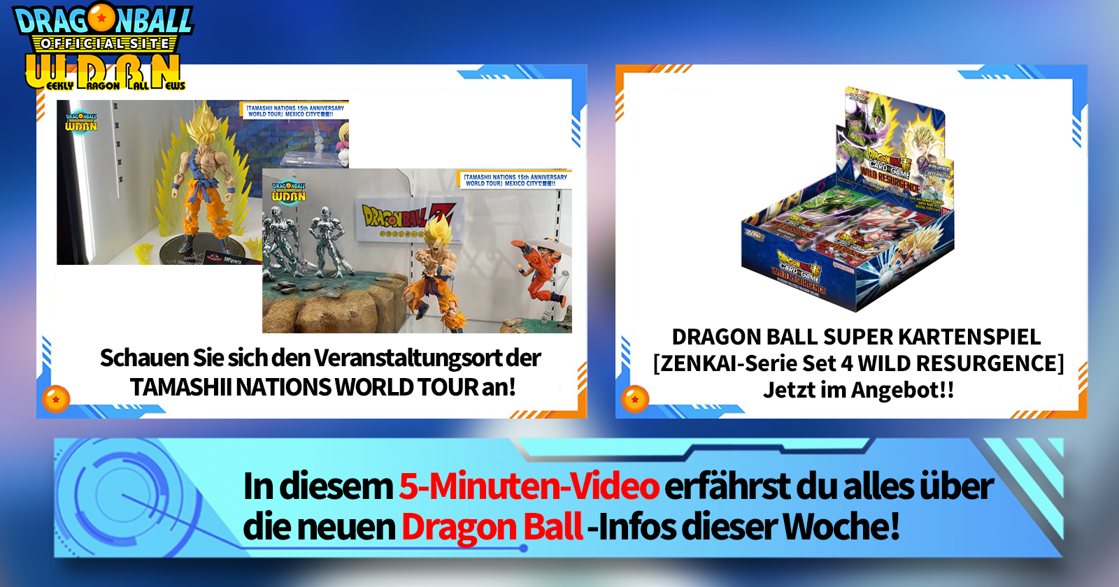„Weekly Dragon Ball News“ ist eine Videoserie, die jeden Montag (JST) aktualisiert wird, um Ihnen die neuesten Nachrichten aus der Welt von Dragon Ball zu liefern! Begleiten Sie V Jump Redakteur Victory Asada, während er über die heißesten Informationen der vergangenen Woche sowie über aktuelle Updates wie neue Produktinformationen und Website-Neuigkeiten für die kommende Woche berichtet!