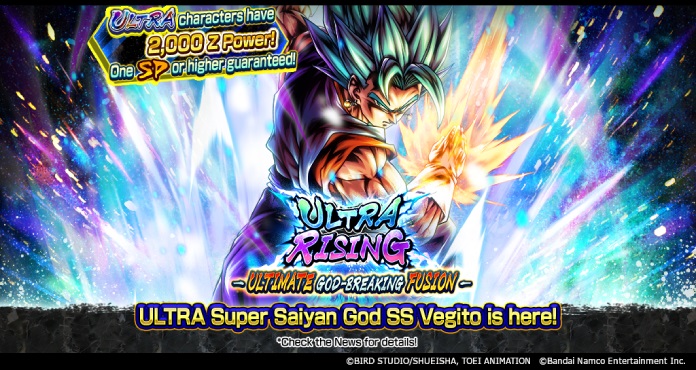 Eine neue Beschwörung, „ULTRA RISING – ULTIMATE GOD-BREAKING FUSION –“, ist jetzt im erfolgreichen App-Spiel Dragon Ball Legends verfügbar! Dies ist eine Step-Up-Beschwörung, bei der alle Schritte 10x aufeinanderfolgende Beschwörungen sind, die garantiert einen SPARKING- oder höheren Seltenheitstropfen enthalten! Bestimmte Schritte enthalten auch zusätzliche Vorteile: Die Drop-Raten für ULTRA-Charaktere werden in Schritt 2 verdoppelt und Schritt 4 ist kostenlos! Und wenn Sie während der gesamten Beschwörung den neuen ULTRA- Super Saiyan God SS Vegito (DBL61-01U) ziehen, wird er mit 2.000 Z-Power fallen!!