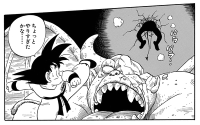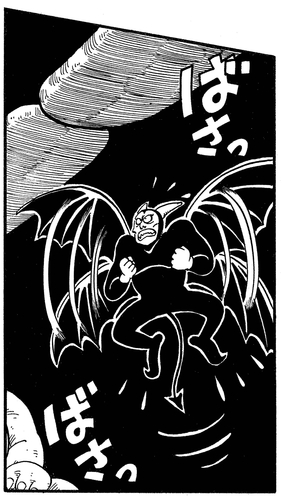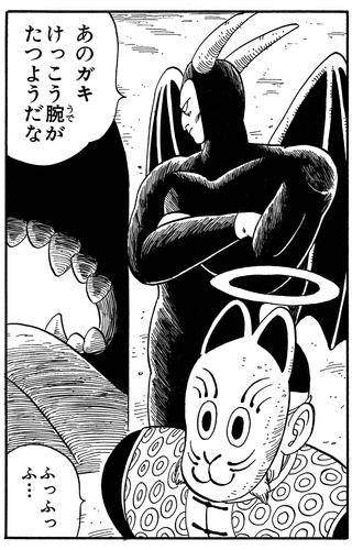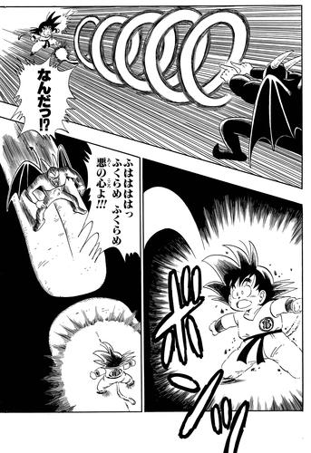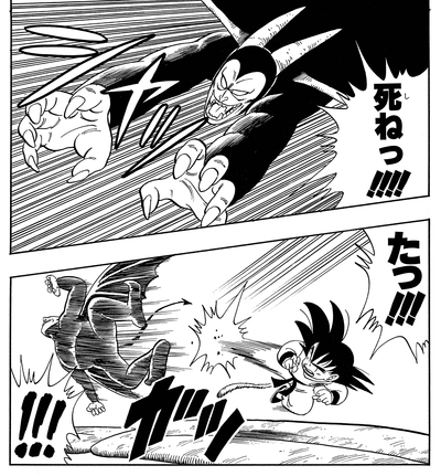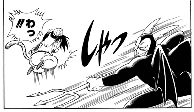 Nachdem sein wertvoller Angriff nutzlos geworden ist, holt Akkuman eine böse aussehende Heugabel hervor und greift damit den jungen Saiyajin an, doch Goku weicht aus und revanchiert sich mit einem Tritt, der den dunklen Teufel zur Rechenschaft zieht.