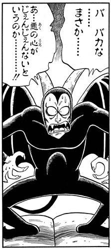 Zurück im Ring fragt Akkuman , ob Goku wirklich damit gerechnet hat, ihn so leicht zu besiegen, worauf der Junge antwortet: „Nein! Ich habe dich nur auf die Probe gestellt!“ Wütend entfesselt Akkuman seine „Beam of Evil“ -Technik, die dazu führen kann, dass sich selbst der kleinste Tropfen des Bösen im Herzen eines Menschen so weit ausdehnt, dass er ihn in Stücke reißt! Es trifft Goku frontal, hat aber schockierenderweise keine Wirkung!