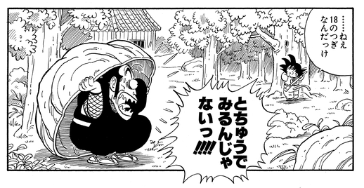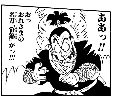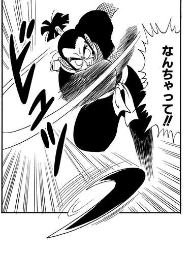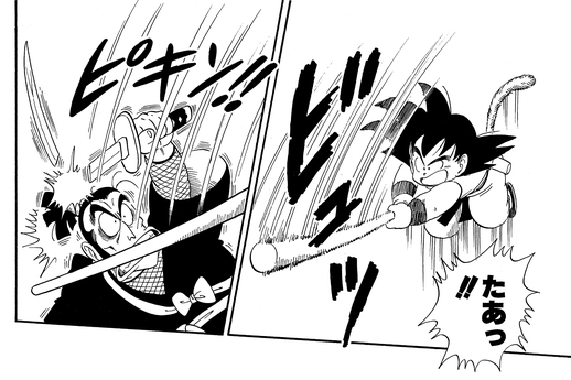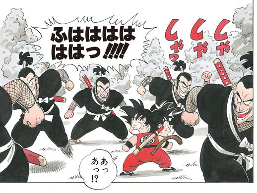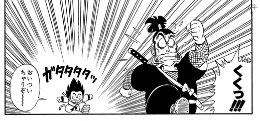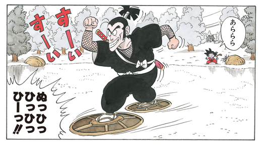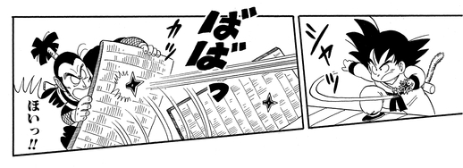 Der junge Saiyajin hat jedoch keine Probleme, mitzuhalten, also beschließt Murasaki, die Krähenfüße fallen zu lassen, um ihn zu bremsen. Goku denkt schnell und zieht schnell ein paar Holzsandalen an, um selbst diesem listigen Hindernis entgegenzuwirken.