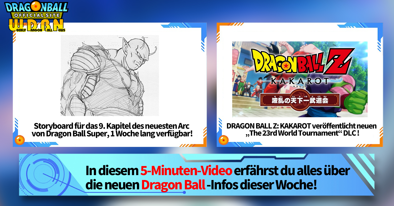 „Weekly Dragon Ball News“ ist eine Videoserie, die jeden Montag (JST) aktualisiert wird, um Ihnen die neuesten Nachrichten aus der Welt von Dragon Ball zu liefern! Begleiten Sie V Jump Redakteur Victory Uchida, wenn er über die heißesten Informationen der vergangenen Woche sowie über aktuelle Updates wie neue Produktinformationen und Website-Neuigkeiten für die kommende Woche berichtet!