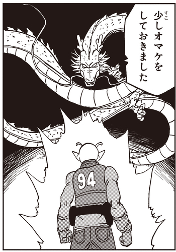 Obwohl die Dragon Balls nicht dort sind, wo er gedacht hatte, gelingt es Dende , Shenron zu verbessern, sodass Piccolo die Dragon Balls verwenden kann, damit der mächtige Drache seine wahre Kraft freisetzt! Dann macht er sich auf den Weg zur Capsule Corporation , wo Bulma bereits alle sieben Dragon Balls gesammelt hat, und äußert seinen Wunsch. Zusätzlich zum Powerup erwähnt Shenron etwas darüber, ein kleines „Extra“ einzubauen, aber was könnte das sein ...?