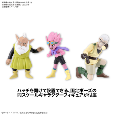 Dieses Modell verfügt außerdem über einen Ausstellungsständer mit SAND LAND -Logo, fliegendem Staub und sogar Reifenspuren, um einen wirklich realistischen Effekt zu erzielen.