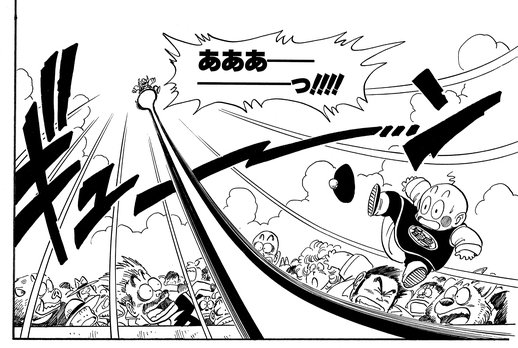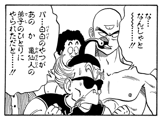 Trotz Tsurusennins prahlerischem Rat: „Laufen Sie, bevor die Bumbles der Schildkrötenschule alle in Ihren Panzern gekocht sind“, erleidet Taopaipai eine vernichtende Niederlage durch Tenshinhan, der überraschend stark geworden ist.