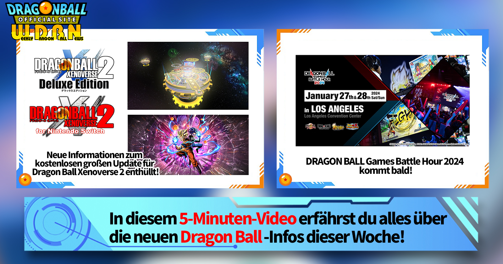 „Weekly Dragon Ball News“ ist eine Videoserie, die jeden Montag (JST) aktualisiert wird, um Ihnen die neuesten Nachrichten aus der Welt von Dragon Ball zu liefern! Begleiten Sie V Jump Redakteur Victory Uchida, wenn er über die heißesten Informationen der vergangenen Woche sowie über aktuelle Updates wie neue Produktinformationen und Website-Neuigkeiten für die kommende Woche berichtet!
