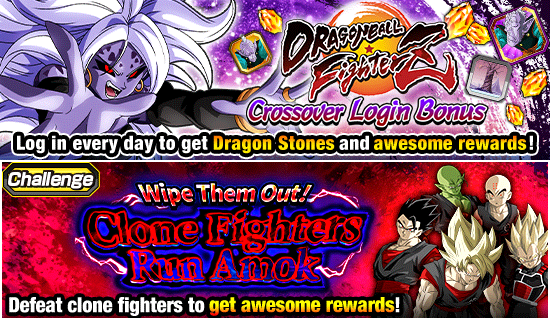 Der Dragon Ball FighterZ Crossover-Anmeldebonus ist aktiviert und darin können Sie [Unterstützung beim Rampaging Clones-Vorfall] Android Nr. 18 (verknüpfter Status) rekrutieren, wenn Sie sich während des Kampagnenzeitraums zum ersten Mal anmelden! Schließe dann Crossover-Spezialmissionen ab, um Erweckungsmedaillen zu erhalten, die du zum Erwachen von Dokkan [Unterstützung bei dem Rampaging Clones-Vorfall] Android #18 (verknüpfter Status) verwenden kannst! Darüber hinaus finden noch viele andere unterhaltsame Events statt, wie zum Beispiel das Challenge-Event „Wipe Them Out! Clone Fighters Run Amok“, bei dem Sie darum kämpfen, innerhalb einer begrenzten Anzahl von Runden so viele Klonkämpfer wie möglich zu besiegen tolle Belohnungen! Tauchen Sie ein in die Welt von Dokkan Battle und haben Sie viel Spaß in der Dragon Ball FighterZ Crossover-Sonderkampagne!