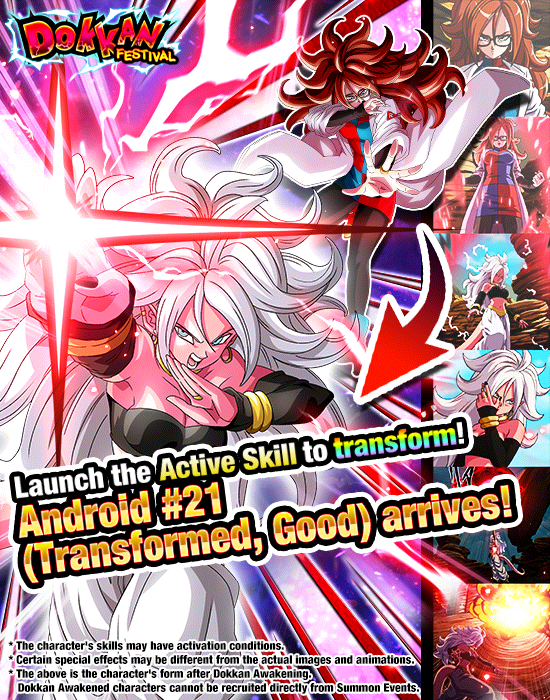 Und das ist nicht alles! Sobald Dokkan erwacht ist, erhält Android #21 (Normal) eine aktive Fähigkeit, die es ihr ermöglicht, sich in Android #21 (Transformiert, Gut) zu verwandeln, sobald bestimmte Bedingungen erfüllt sind! Nach der Verwandlung erhält diese mächtige Android-Kämpferin eine neue aktive Fähigkeit, die ihre Angriffe gegen alle Typen effektiv macht!