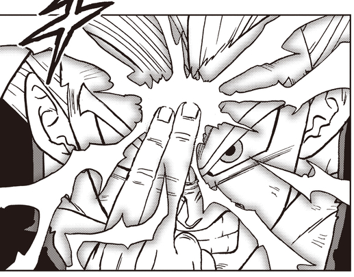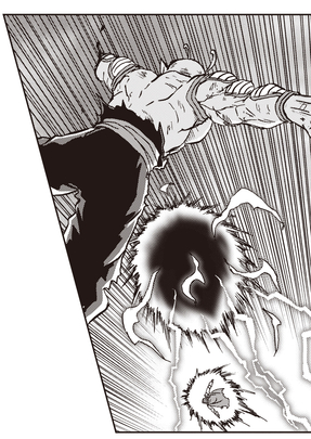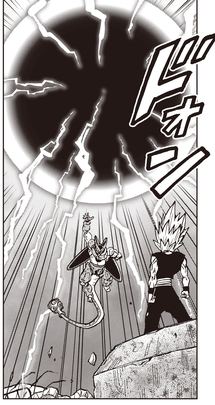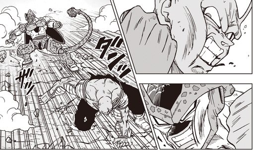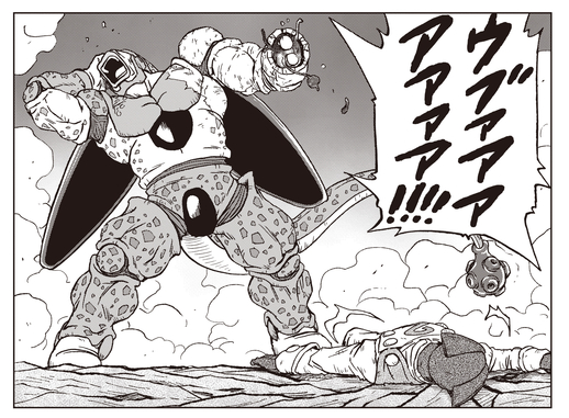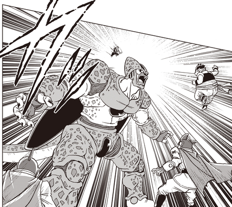 Doch obwohl Cell Max bei der Abwehr des Angriffs seinen linken Arm verlor, tobt er unvermindert weiter.