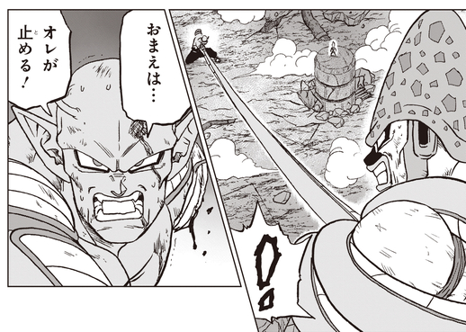 Piccolo setzt sein Leben aufs Spiel, um Cell Max zu verlangsamen, rutscht jedoch für einen Moment aus, was dazu führt, dass der Namekian Krieger eine Flut von Strafangriffen einsteckt.