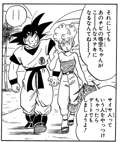 Nachdem sie Goku am Arm genommen hat, lädt sie ihn ein und sagt: „Wir sollten etwas trinken gehen … nachdem du diese Saiyajins verprügelt hast!“