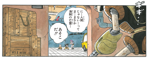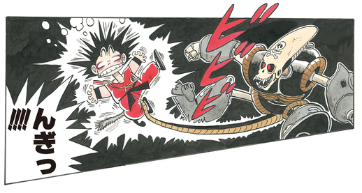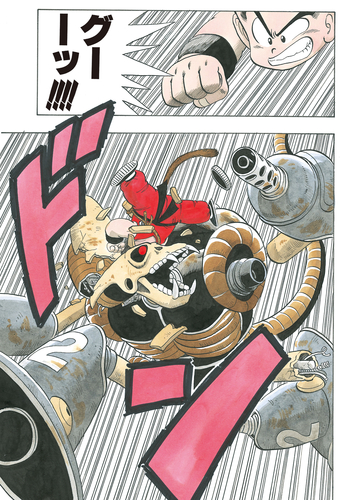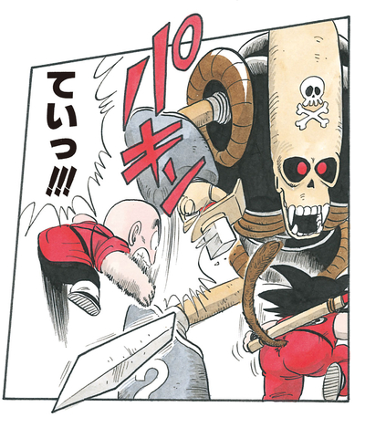 Goku springt aus dem Wasser, um zu entkommen, und springt mit seinem Nyoibo auf die Spitze eines Gebäudes. Der Piratenroboter macht sich bald auf die Suche nach dieser potenziellen Beute, kann den jungen Saiyajin jedoch nicht finden. In der Verwirrung startet Goku einen verheerenden Angriff von Jan-Ken (Fels) aus der Luft! Der Treffer landet direkt auf dem Hinterkopf des Piratenroboters, bricht ihn in zwei Teile und lässt den Bot explodieren!!