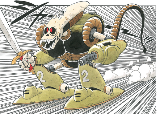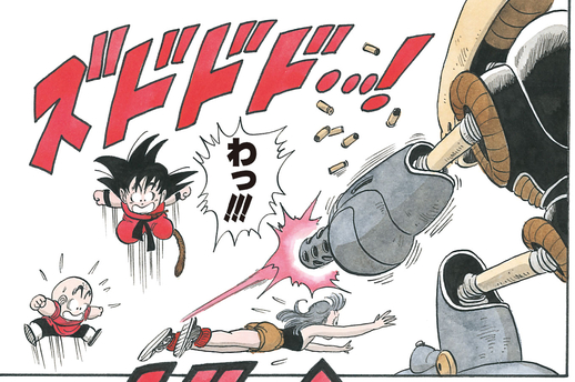 Der Roboter feuert mit seinem linken Arm eine Maschinengewehrsalve ab und versucht, unsere Helden in Scheiben zu schneiden und zu würfeln, aber sie weichen aus und Krillin zerbricht furchtlos das Schwert des Piratenroboters mit einem gut platzierten Hieb.