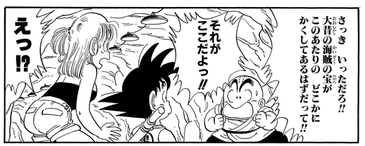 Krillin scheint eine Legende über einen Piratenschatz zu kennen, der vor langer Zeit in dem Bereich des Ozeans versteckt war, in dem unsere Helden landen. Es scheint, als ob dieser Schatz in dem Piratenversteck aufbewahrt wurde, in das sie gestolpert waren, und dass der Piratenroboter ihn seit der Antike bewacht hatte.
