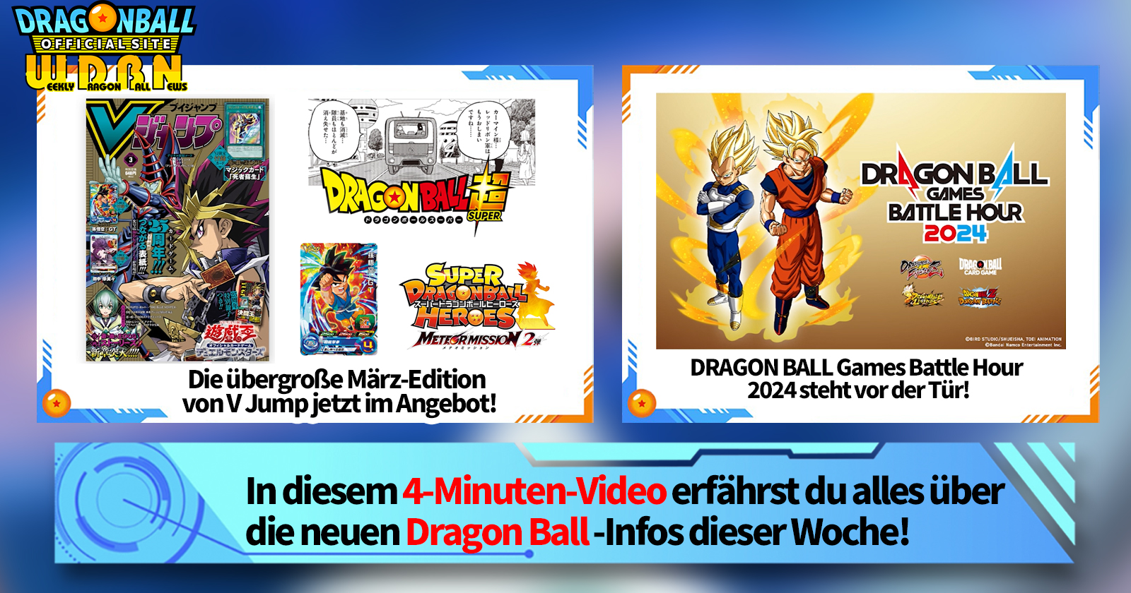 „Weekly Dragon Ball News“ ist eine Videoserie, die jeden Montag (JST) aktualisiert wird, um Ihnen die neuesten Nachrichten aus der Welt von Dragon Ball zu liefern! Begleiten Sie V Jump Redakteur Victory Uchida, wenn er über die heißesten Informationen der vergangenen Woche sowie über aktuelle Updates wie neue Produktinformationen und Website-Neuigkeiten für die kommende Woche berichtet!