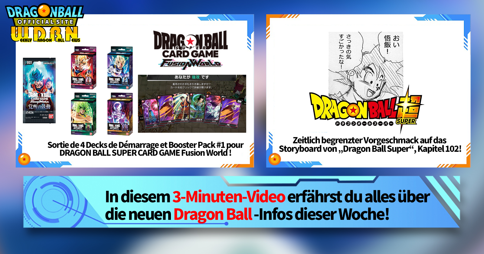 „Weekly Dragon Ball News“ ist eine Videoserie, die jeden Montag (JST) aktualisiert wird, um Ihnen die neuesten Nachrichten aus der Welt von Dragon Ball zu liefern! Begleiten Sie V Jump Redakteur Victory Uchida, wenn er über die heißesten Informationen der vergangenen Woche sowie über aktuelle Updates wie neue Produktinformationen und Website-Neuigkeiten für die kommende Woche berichtet!