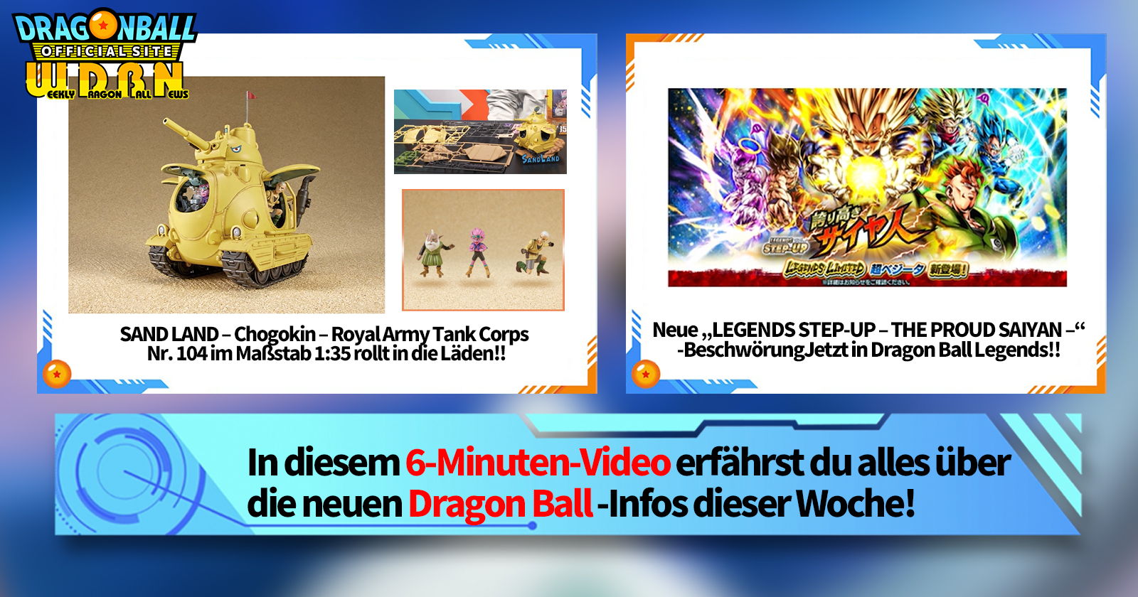 „Weekly Dragon Ball News“ ist eine Videoserie, die jeden Montag (JST) aktualisiert wird, um Ihnen die neuesten Nachrichten aus der Welt von Dragon Ball zu liefern! Begleiten Sie V Jump Redakteur Victory Uchida, wenn er über die heißesten Informationen der vergangenen Woche sowie über aktuelle Updates wie neue Produktinformationen und Website-Neuigkeiten für die kommende Woche berichtet!