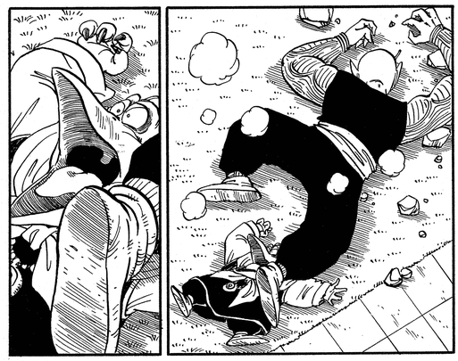 Piano beobachtet den erbitterten Kampf aus nächster Nähe, wird jedoch vom Körper seines Meisters zerquetscht, als Piccolo durch einen verheerenden Schlag von Goku in die Luft geschleudert wird.