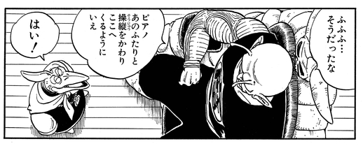 Als Piccolos neueste Kreation Cymbal von Yajirobe getötet wird, verwirft Piano zunächst die Idee, dass einer ihrer bösen Clans verlieren könnte, und sagt: „Wie könnte es irgendjemanden auf dieser Welt geben, der in der Lage ist, einen von uns zu besiegen …?“ Piccolo akzeptiert die Situation jedoch sofort und brüllt: „Wie, bitte sagen Sie mir, ist Cymbal dann gestorben?!!!“ vor Wut.