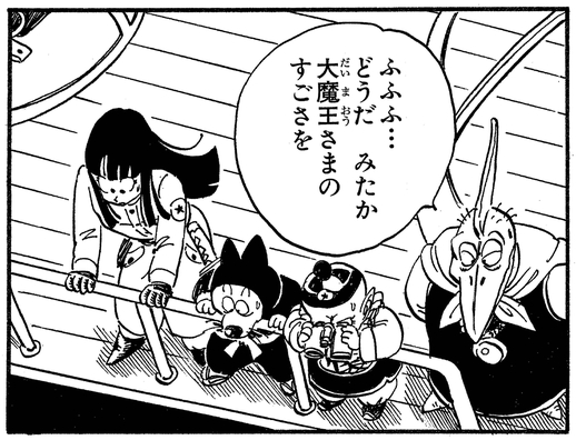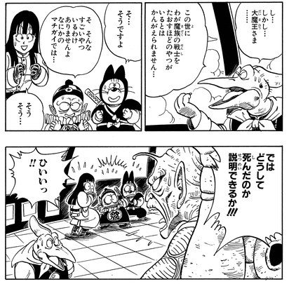 Wütend über den Tod seiner dämonischen Nachkommen schwört Piccolo , diesen neuen Feind selbst zu vernichten und befiehlt, ihre Flugbasis dorthin zu verlegen, wo sie getötet wurden. Piano und die Pilaf Gang bleiben an Bord des Schiffes, während sein Meister gegen Goku kämpft, und Piano sagt ruhig: „Erkennen Sie jetzt die Größe des Dämonenkönigs?“ als Piccolo Goku schnell mit einer schockierenden Demonstration böser Macht überwältigt.