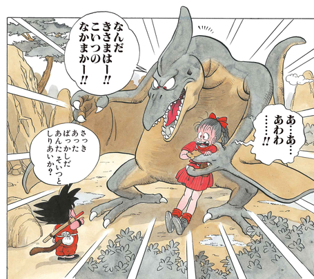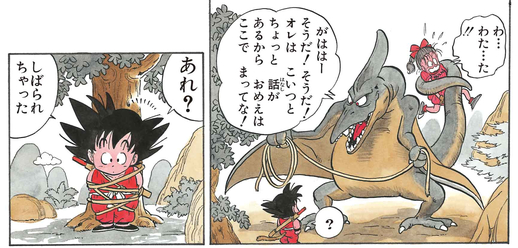 Als Goku einen Schrei hört, geht er zu seiner brandneuen Begleiterin Bulma, doch stattdessen trifft er auf dieses riesige Reptil! Der unschuldige Junge fragt: „Bist du ein Freund von ihr?“, worauf Pteranodon antwortet: „...es gibt etwas, das ich privat mit ihr besprechen möchte, okay? Du wartest einfach hier!“ Zur Sicherheit fesselt er Goku sogar an einen Baum in der Nähe!